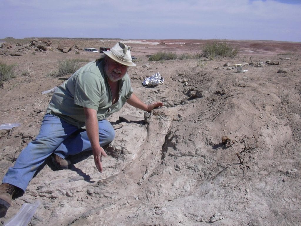 I began by slowly and carefully removing the sediment from the top of the site. There were fairly good size pebbles and dirt. Again, the river rock is telling us what this environment was like. I used a broom at first then my paintbrush and within about 2 minutes I discovered the proximal end of a long bone, it was a tibia of a sauropod, a long neck dinosaur. It was about 3 feet long and 6 inches wide. But before I fully exposed that bone, I uncovered another, a pubis, part of the hip structure of a sauropod. Then another pubis and another bone, probably the fibula and a small caudal vertebra, a great find. After working for quite a while removing overburden from the little dig site, I as a bit tired and decided to walk around and see what else was being discovered. As I walked around at the bottom of the little hill, a friend from a previous dig pulled up to the site. It was Frank from NYC. We smiled shook hands, it was old home week. We had been up to our elbows in the badlands of Montana together. We renewed our friendship and toured the site together. Boy he was as excited as I was as we toured the site. I proudly showed him my site and we began to discuss our plan of attack for the nest day. Before I left that day, 7pm, I saw a scorpion, several lizards a huge chunk of petrified wood and tons of dinosaur bones.