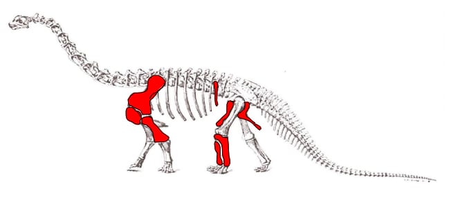 The bones I found were as follows. A tibia, fibula, illium, pubis, humerus, 2 scapulas, a rib, corocoid. Here is a diagram of the bones on a representation of the skeleton of a Camerasaurus.