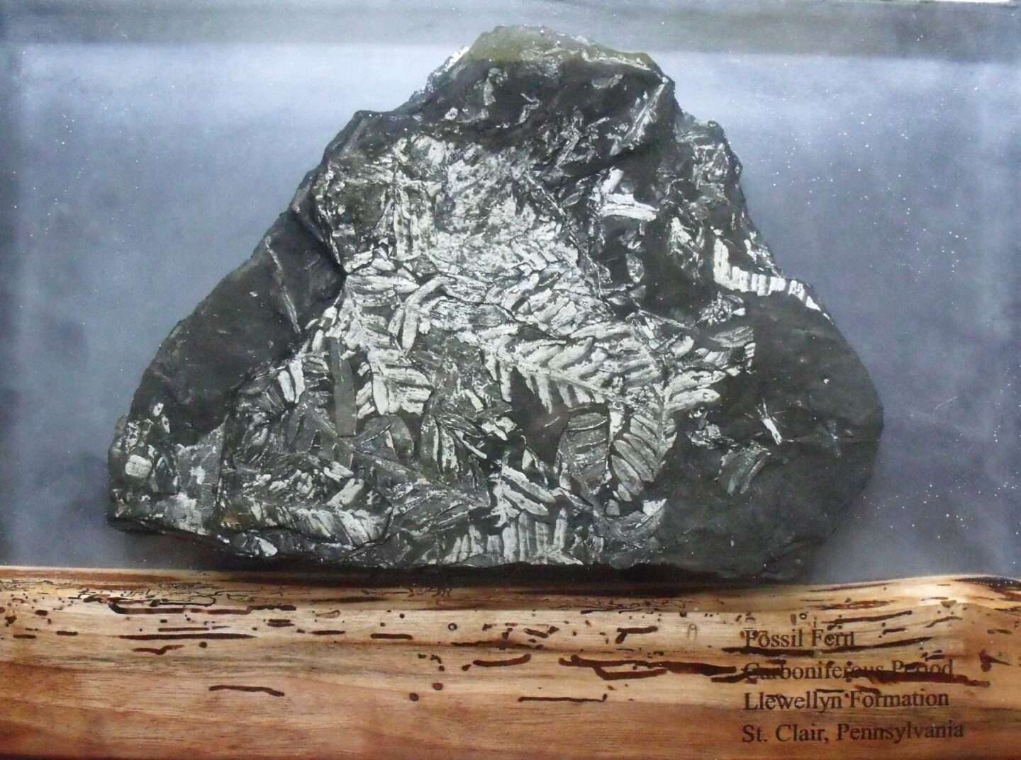 The Pennsylvanian Fossil Fern Charcuterie Board exhibits fossils found within the sediments of discarded rock. Because it was of no use to the coal companies and it was tossed onto a pile of unusable rock. They can be found by collectors. The shale forms when fern leaves fall to the ground and are quickly covered by sediment. Because of the low level of oxygen the leaves are preserved as impressions.