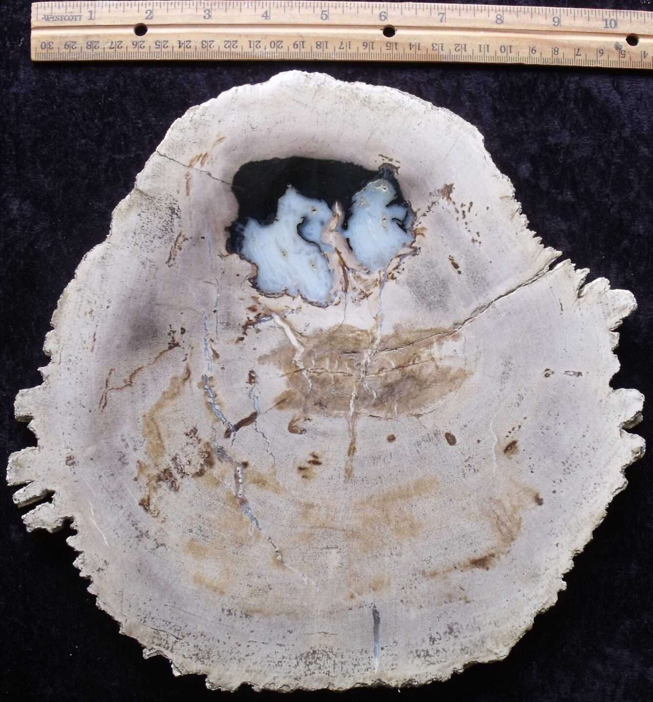 During the late Tertiary Period (66 to 2.6 MYA) masses of rainforests surrounded the volcanos of Indonesia. But after volcanic eruptions the trees were buried by ash and lava. Because they were buried so quickly microbes were eliminated. And if these microbes were not killed hey would begin to rot the wood. As it decomposed the wood was replaced by silica rich minerals such as chalcedony, quartz, calcite opal and jasper. The beautiful colors of the Petrified wood slabs comes from the trace elements. Manganese creates blue and black. Traces of Iron would create brown and orange colors.